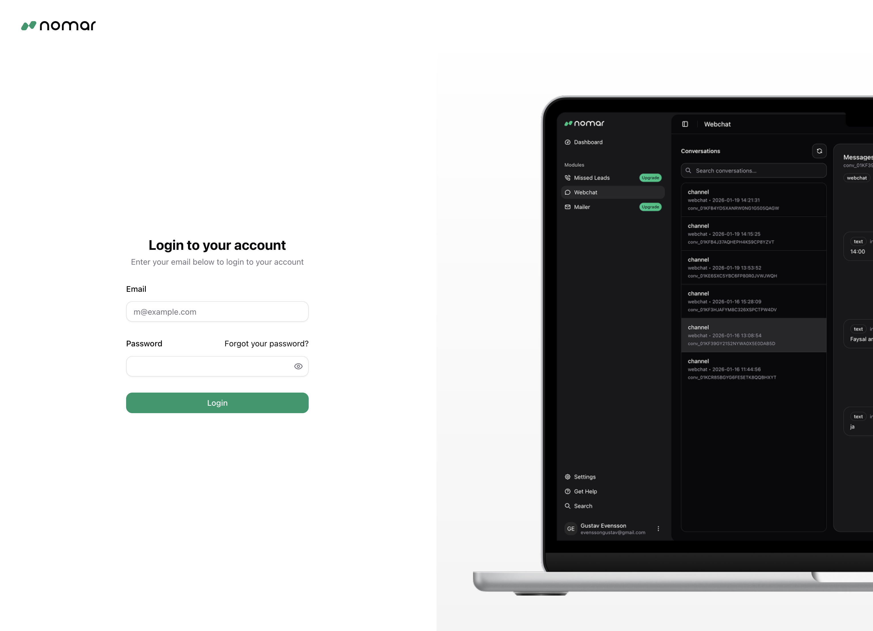 Nomar Nexus binder ihop allt. Alla konversationer från Missed Leads och Webchat, meddelanden och deras status – samlat på en plats så att ni har överblick utan att hoppa mellan inkorgar eller system.